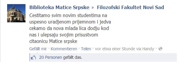 Ne znam gde bih s ovom temom. Pitam se koliko je potrebno da se na fejsu bude pismen, pa makar to bila i Biblioteka Matice srpske. Da li je njima uopšte potrebno da koriste veliko slovo i dijakritike, ili imaju pravo da pišu kao što govore.